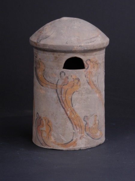 漢代,酒泉北稍門外出土。高19.4厘米,底徑11.6厘米。筒狀,球面頂,上部有一拱形倉門,筒身飾紅、黃、黑彩繪云氣紋。展現(xiàn)了當時糧食豐收后的貯藏場景與人們對豐饒的祈愿。