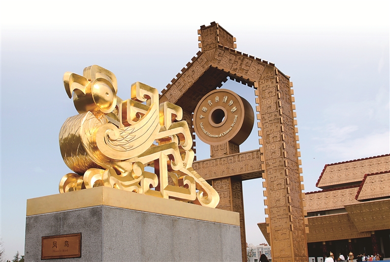 中國(guó)文字博物館前廣場(chǎng)。前方為鳳鳥(niǎo)雕塑,取形于青銅器鳳鳥(niǎo)紋。后方為字坊,取金文中“字”之形。中國(guó)文字博物館供圖
