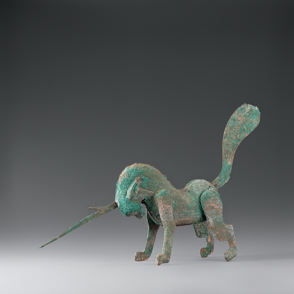 漢代,酒泉市出土,一級文物。俯首含胸,頸部高聳,頭生獨角,角向前刺,扁尾高揚,四足跨張作角斗狀,全身鑄有獸毛紋飾,姿態(tài)威嚴,仿佛隨時準備躍起。它是中國古代文化中能夠分辨善惡曲直的“正義的化身”——獬豸。