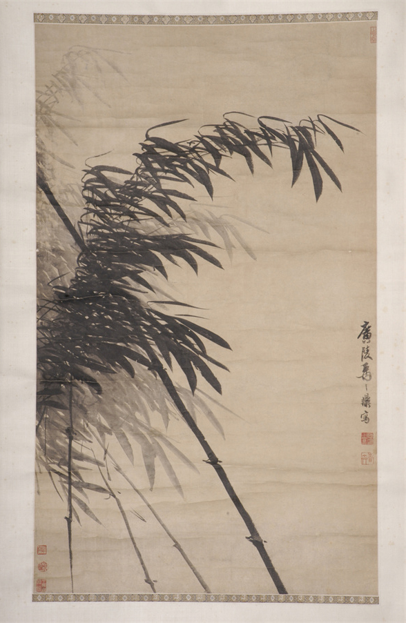 清代,縱高102厘米,橫寬60厘米。作者運筆逆來順往,橫涂豎抹,濃墨勾節(jié),淡墨寫葉,濃淡相生。在疾風的鼓蕩下,健竹一竿逆風巋然,嫩竹三枝不彎不揖,枝葉順風飛揚而不折。禹之鼎,字尚吉,一字尚基,號慎齋。廣陵(今江蘇興化)人,后寄籍江都(今江蘇揚州)。清康熙二十年(1681年)官鴻臚寺序班,以畫供奉入暢春園。善畫人物、山水,尤精寫真。