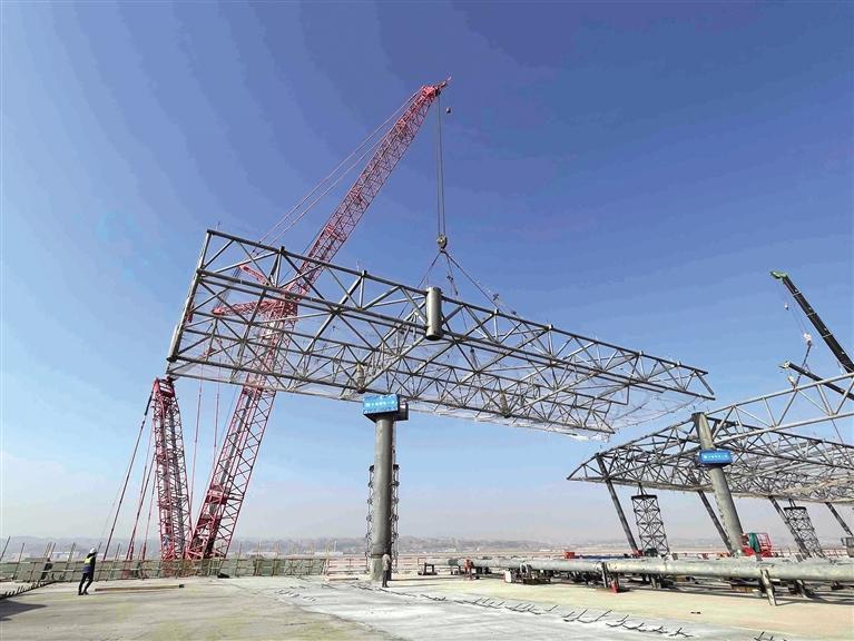 記者了解到,蘭州中川國際機場三期擴建工程新建航站樓共有A、B、C、D四條指廊,是航站樓重要組成部分,每條指廊長117米、寬90米,屋蓋投影面積20.45萬平方米,建筑面積39.73萬平方米。此次封頂?shù)臑楹秸緲荄指廊部分,由支撐體系和屋蓋鋼桁架結(jié)構(gòu)組成,形成了一個不規(guī)則的自由曲面空間,總投影面積達到了29500平方米,總重量達2800多噸。根據(jù)總體計劃,蘭州中川國際機場三期航站樓工程鋼結(jié)構(gòu)將于2022年底實現(xiàn)全面封頂。