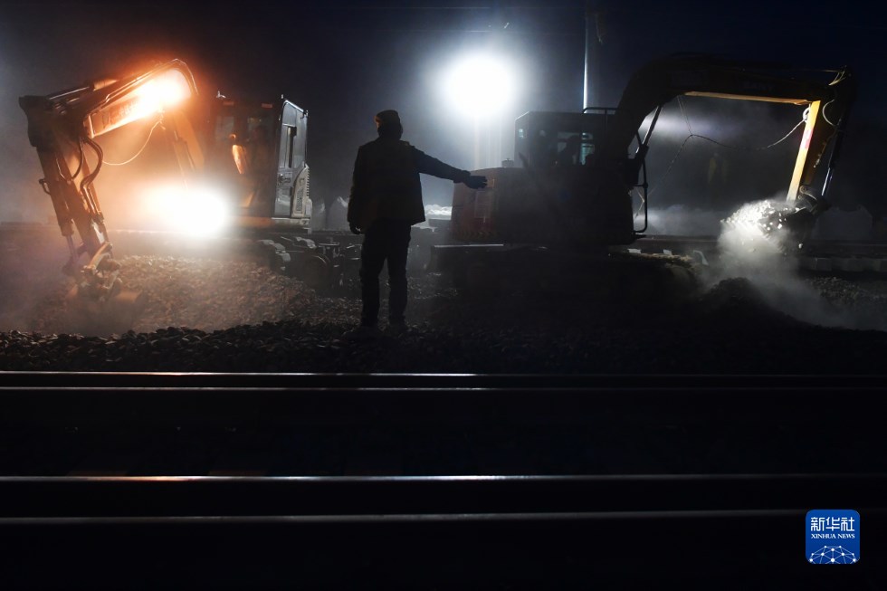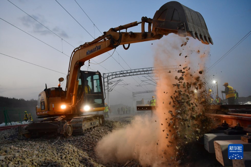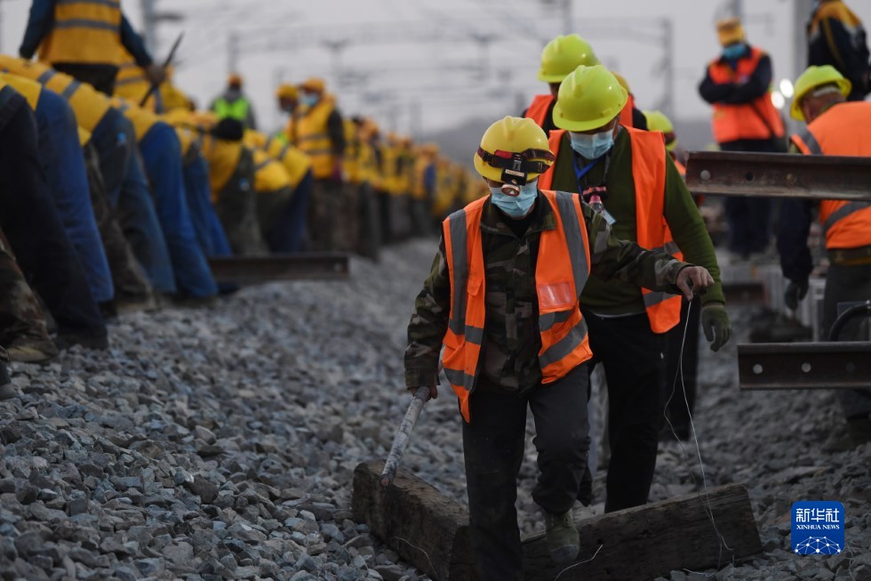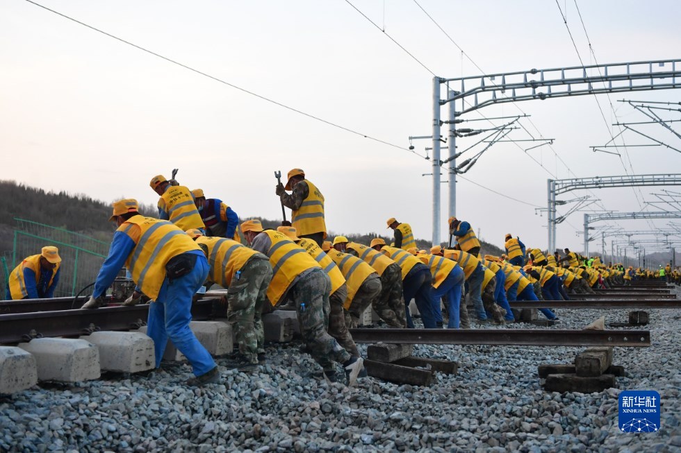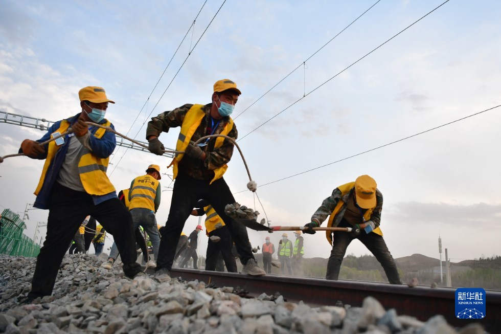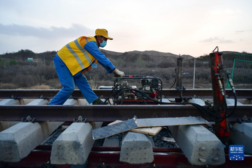 中鐵十一局建設(shè)者在中蘭客專(甘肅段)接入中川城際鐵路道岔插鋪施工現(xiàn)場作業(yè)(4月26日攝)。新華社記者 陳斌 攝