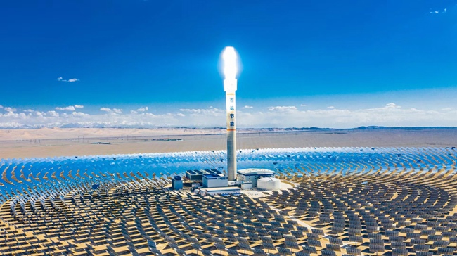 位于甘肅省敦煌市光電產(chǎn)業(yè)園區(qū)的首航高科敦煌100兆瓦熔鹽塔式光熱電站內(nèi),1萬(wàn)余面定日鏡以同心圓狀圍繞著260米高的熔鹽塔逐日發(fā)電。敦煌市委宣傳部供圖