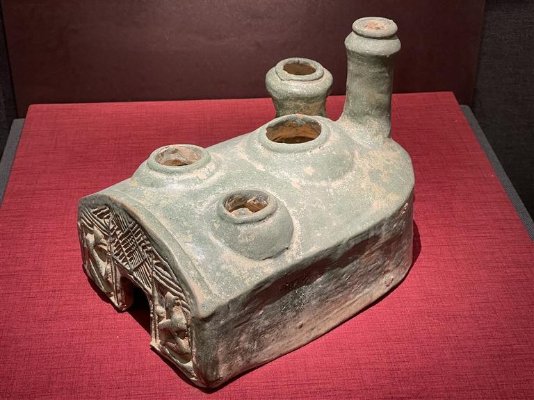 綠釉陶灶高21厘米,長28厘米,寬19.5厘米,為蘭州市博物館館藏二級(jí)文物。陶灶反映了當(dāng)時(shí)人們的生產(chǎn)生活和思想觀念。漢代之所以流行陶灶模型,主要原因有二,一是兩漢時(shí)期大土地所有制經(jīng)濟(jì)的盛行使得豪門貴族占據(jù)社會(huì)主要地位,而“事死如事生”的觀念促使他們隨葬大量明器,以求在陰間繼續(xù)享受榮華富貴。二是由于漢代的祭灶思想助推了陶灶的流行。
