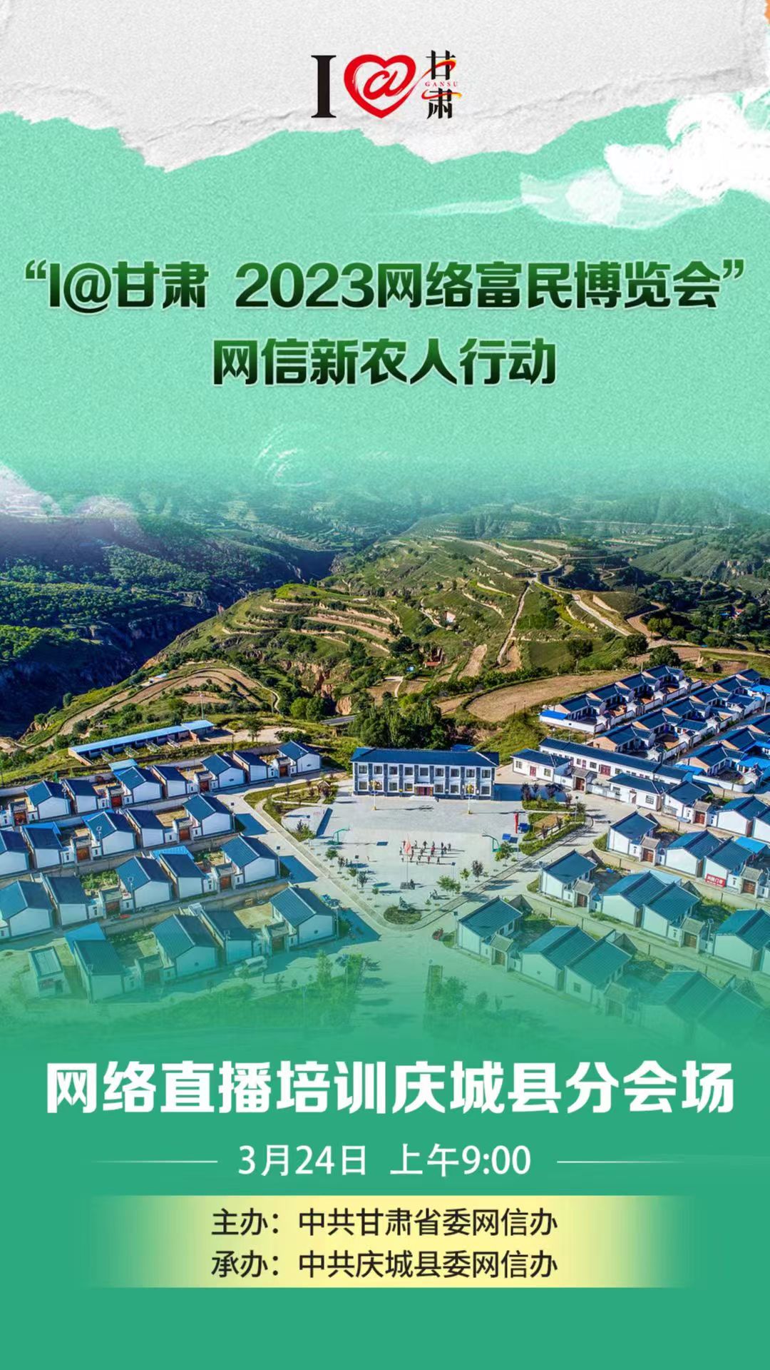 甘肅省委網(wǎng)信辦“I@甘肅 2023網(wǎng)絡(luò)網(wǎng)絡(luò)富民博覽會(huì)”網(wǎng)信新農(nóng)人行動(dòng)第4場(chǎng)網(wǎng)絡(luò)主播培訓(xùn)班,將于3月24日在慶陽(yáng)市慶城縣舉辦