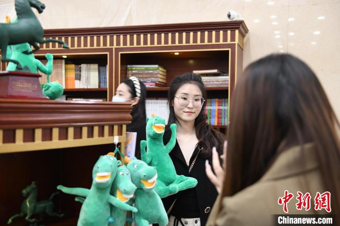 圖為游客在甘肅省博物館推出的文創(chuàng)產品前合影留念。戴文昌攝