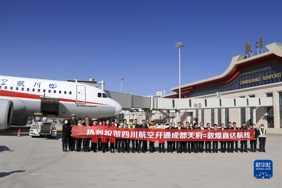 3月26日,由四川航空公司執(zhí)飛的成都至敦煌往返直達航線正式通航。這是首航航班機組人員與機場工作人員在甘肅敦煌莫高國際機場合影。新華社發(fā)(張曉亮攝)