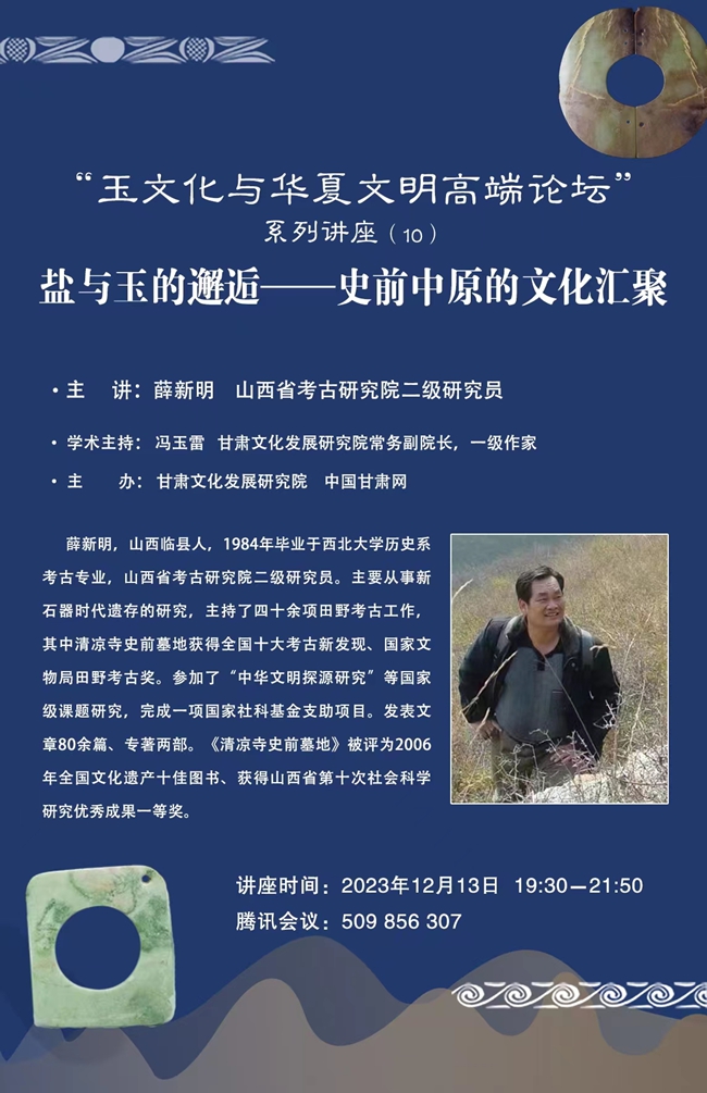 12月13日晚,山西省考古研究院二級(jí)研究員薛新明在線做了題為《玉器所見齊家文化時(shí)期甘青地區(qū)與關(guān)中地區(qū)的交流互動(dòng)》的學(xué)術(shù)報(bào)告。這是甘肅文化發(fā)展研究院主辦的“玉文化與華夏文明高端論壇”系列講作活動(dòng)第10講,也是今年的壓軸之講。