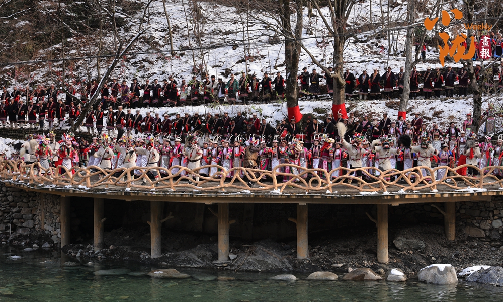 河畔的小路上和河岸的觀景臺(tái)上,白馬人身著特色服飾,錯(cuò)落有致,載歌載舞,跳起了獨(dú)具魅力的“池哥晝”。