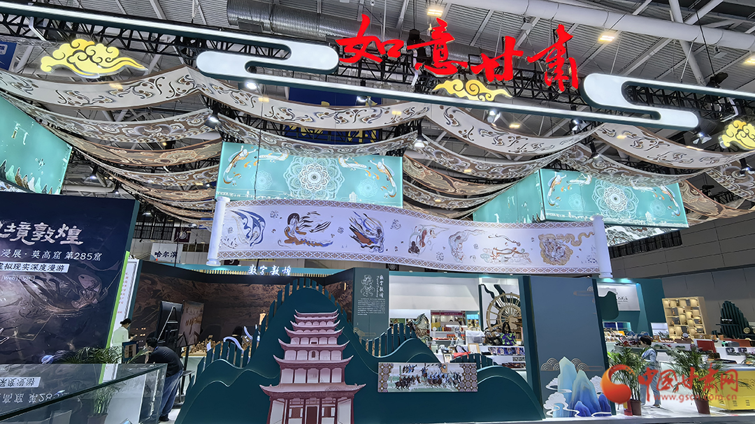 據(jù)了解,甘肅主題館位于深圳國(guó)際會(huì)展中心文化產(chǎn)業(yè)綜合展9號(hào)館,展陳面積510平方米,以主線貫穿、特色鮮明、視覺(jué)宏觀、內(nèi)容豐富為總體設(shè)計(jì)宗旨,采用敦煌壁畫(huà)中石綠為主色調(diào),頂部裝飾敦煌壁畫(huà)中藻井圖及線條,融入“九色鹿”“飛天”等設(shè)計(jì)元素,突出甘肅的歷史感和雄渾大氣。