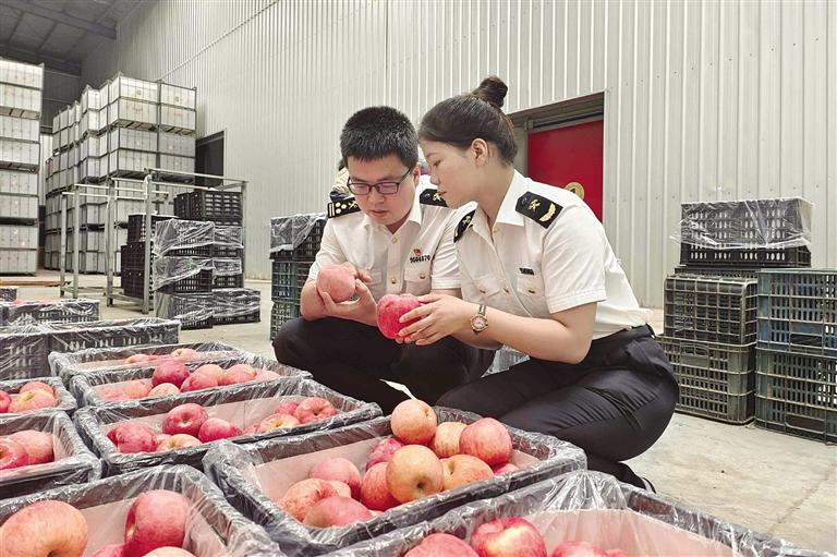 圖為海關(guān)關(guān)員檢查出口水果。據(jù)悉,上半年甘肅省出口水果價(jià)值4.56億元,同比增長(zhǎng)42.7%。