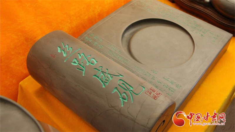 嘉峪石硯,取材于嘉峪山后的黑山峽深處,故又稱“黑山石硯”,是目前所知最早的古石硯之一。這種石硯質(zhì)堅而細、扣之有聲,發(fā)墨快而不損毫,儲墨久而不干,“有史記載的三百多種石硯中,只有嘉峪石硯是帶有銘文出土的。這對于石硯的研究具有重要的史料價值。”劉宗學向?qū)嵺`團成員系統(tǒng)地講述了嘉峪石硯的傳承歷史,并展示了自己以絲綢之路為主題創(chuàng)作的“絲路盛硯”組合石硯。這套石硯主要以甘肅十四個地州市的建筑、景觀、歷史人物為內(nèi)容,體現(xiàn)了甘肅省的根脈文化、黃河文化、長城文化、絲路文化、紅色文化等五大文化,表現(xiàn)出甘肅在絲綢之路經(jīng)濟發(fā)展與文化交流中的重要作用。
