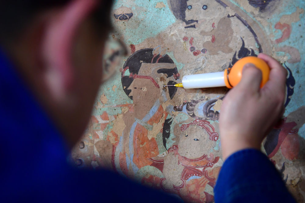 工作人員在修復出現(xiàn)病害的壁畫。記者 杜哲宇 攝