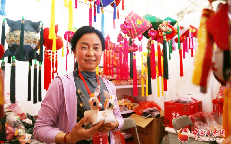 在展館的一角,來自慶城的一位香包繡制商戶喬志梅正在現(xiàn)場推銷著自己帶來的產(chǎn)品。其中驢形香包最為顯眼,據(jù)她介紹,驢形香包多數(shù)呈現(xiàn)黑色,有忠厚、老實之寓意,在當(dāng)?shù)貥O受喜愛。但她制作的驢形香包,通體為白色,鬃毛為粉色,驢耳一上一下較為可愛俏皮。