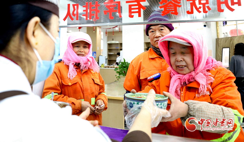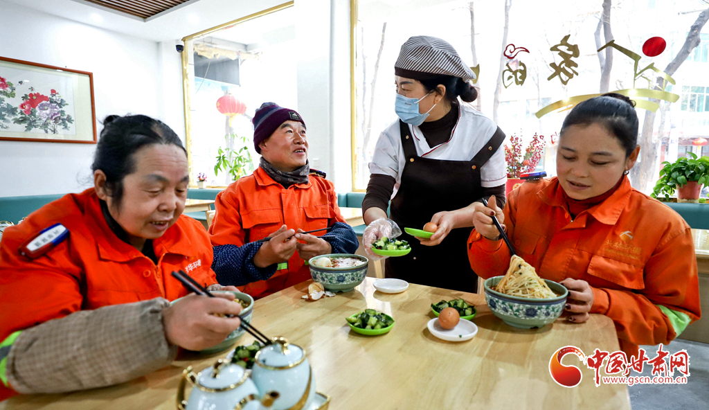 1月29日清晨,張掖市臨澤縣樂(lè)民愛(ài)心餐廳內(nèi),剛剛結(jié)束清掃的環(huán)衛(wèi)工人們圍坐在一起,吃著熱騰騰的大肉面,勞作的疲憊與清晨的寒意漸漸消散。