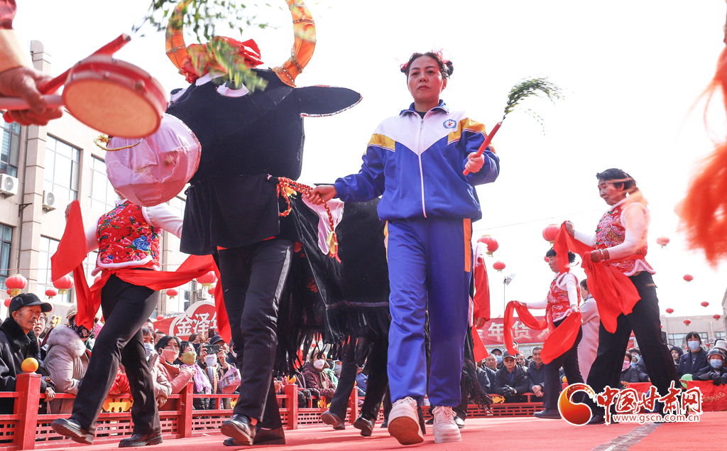 3月3日,張掖市臨澤縣金澤廣場上,群眾表演“驚牛”戲。