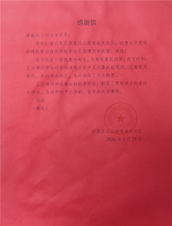 近日,一封社區(qū)致蘭州大學(xué)的感謝信,讓該校物理科學(xué)與技術(shù)學(xué)院學(xué)生王浩博的暖心事跡走進(jìn)公眾視野。2026年3月3日,元宵夜,放假居家的他偶遇居民樓突發(fā)火情,憑借校園培訓(xùn)習(xí)得的消防技能,沉著處置初起火災(zāi)、轉(zhuǎn)移危險(xiǎn)物品,以本能之舉守護(hù)鄰里安全,彰顯新時(shí)代青年的責(zé)任與擔(dān)當(dāng)。