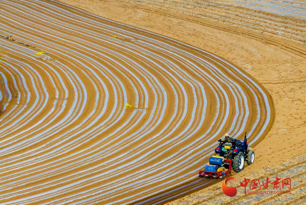 春日,走進(jìn)定西臨洮的田間地頭,一壟壟覆膜蜿蜒如銀色絲帶,在暖陽下泛起粼粼波光。洮河水畔,杏花初綻,村民們正彎腰點(diǎn)種、培土壓膜。新翻的泥土氣息混著花香彌漫田間。農(nóng)機(jī)轟鳴處,白膜與藍(lán)天相映,勾勒出黃土高原上最動人的春耕畫卷。