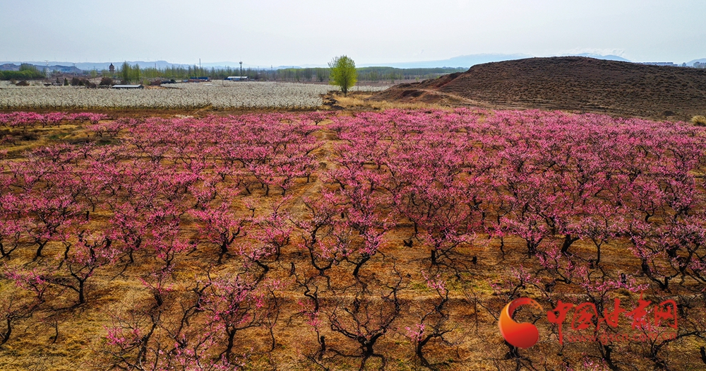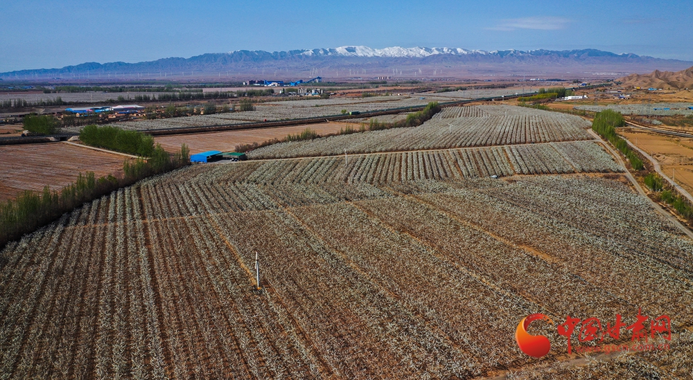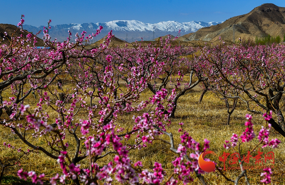 谷雨即將到來(lái),景泰縣獵虎山村境內(nèi)的數(shù)百畝桃園花開(kāi)正紅,比鄰的條山農(nóng)場(chǎng)萬(wàn)畝梨園梨花正白。目光掠過(guò)桃園、梨園,遠(yuǎn)眺西南方的祁連山東端余脈壽鹿山,皚皚白雪覆蓋山頂,青色的山巒環(huán)繞四周,三者同框猶如一場(chǎng)視覺(jué)盛宴,令人沉醉。