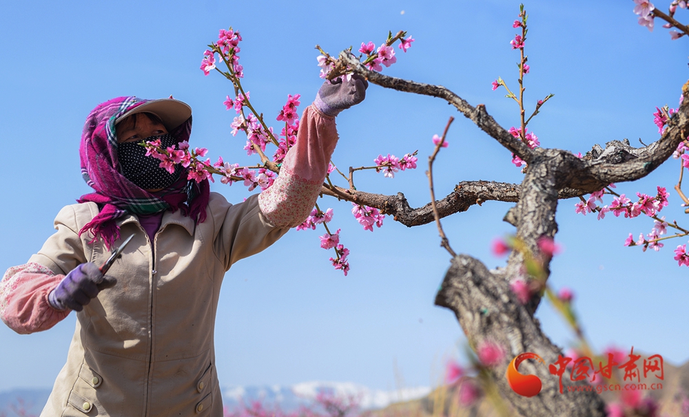 粉桃灼灼綴虬枝,農(nóng)人巧手授花時(shí)