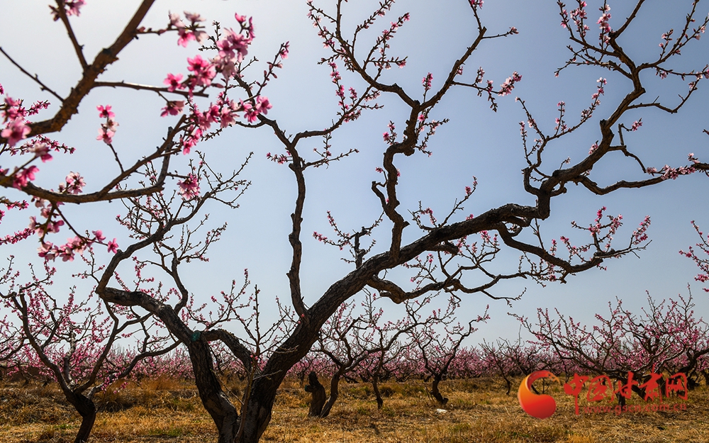 春風(fēng)吹過(guò)戈壁田,漫坡桃樹(shù)綻紅顏