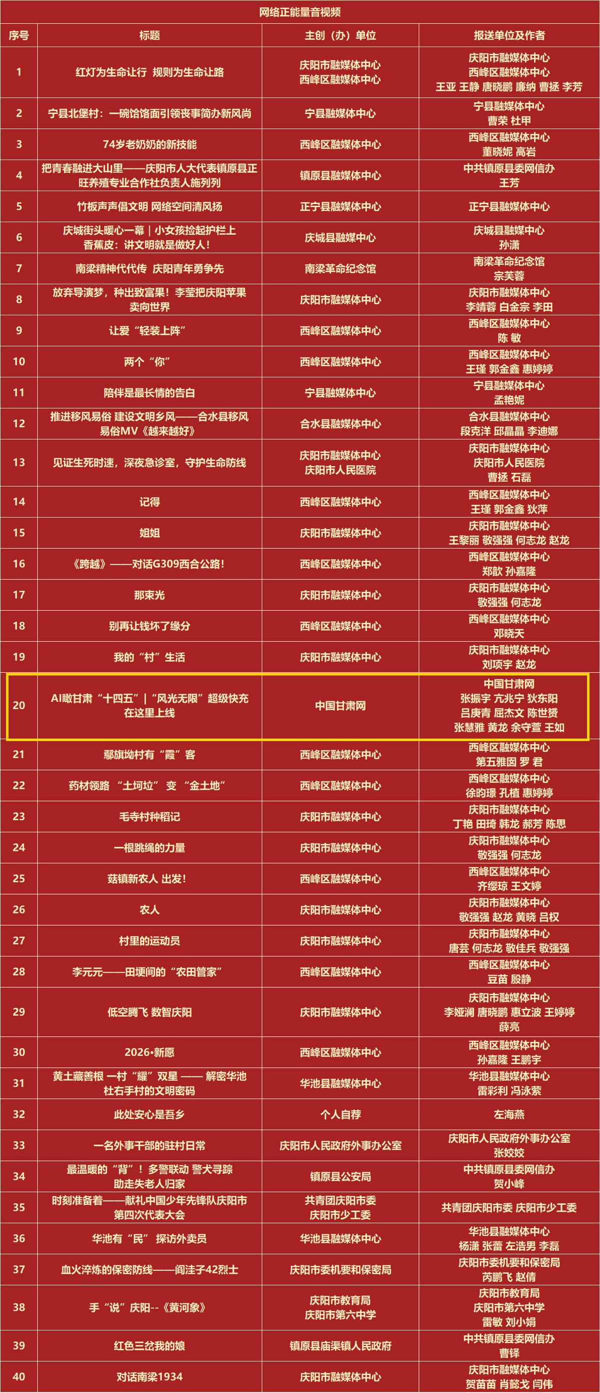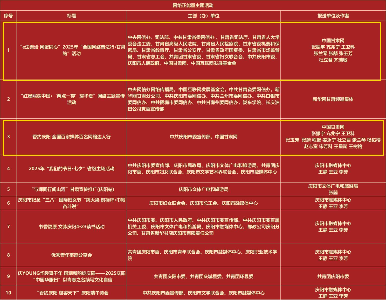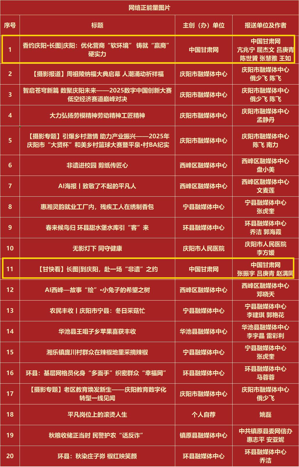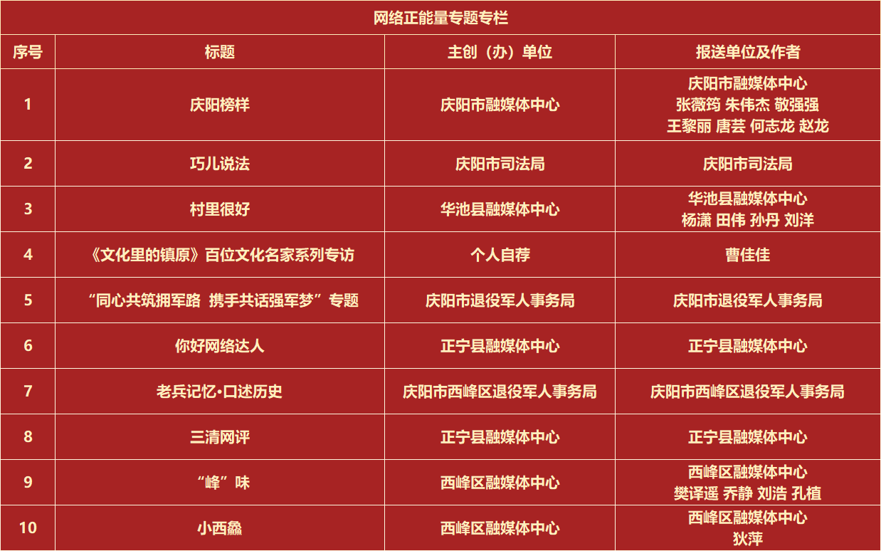 活動(dòng)自啟動(dòng)以來,得到了社會各界的廣泛關(guān)注和積極參與。入選作品涵蓋了文字、圖片、音視頻、專題專欄等多種類型的網(wǎng)絡(luò)正能量精品,既有感人至深的奮斗故事,展現(xiàn)了慶陽人民在新時(shí)代背景下的拼搏與進(jìn)??;也有富有創(chuàng)意的網(wǎng)絡(luò)文化產(chǎn)品,以新穎的形式和獨(dú)特的視角傳遞了正能量。其中,中國甘肅網(wǎng)選送的作品在本次評選中脫穎而出,榮獲多個(gè)獎(jiǎng)項(xiàng)?!?/span>e法耀隴原|走進(jìn)南梁話法治 解碼藏在“馬錫五審判”里的司法智慧獲得網(wǎng)絡(luò)正能量文字作品;香約慶陽·長圖|慶陽:優(yōu)化營商“軟環(huán)境” 鑄就“贏商”硬實(shí)力》《【甘快看】長圖|到慶陽,赴一場“非遺”之約獲得網(wǎng)絡(luò)正能量圖片作品;《AI瞰甘肅“十四五”|“風(fēng)光無限”超級快充在這里上線》獲得網(wǎng)絡(luò)正能量音視頻作品;《“e法善治 網(wǎng)聚同心”2025年“全國網(wǎng)絡(luò)普法行·甘肅站”活動(dòng)》《香約慶陽 全國百家媒體百名網(wǎng)絡(luò)達(dá)人行》獲得網(wǎng)絡(luò)正能量主題活動(dòng)。