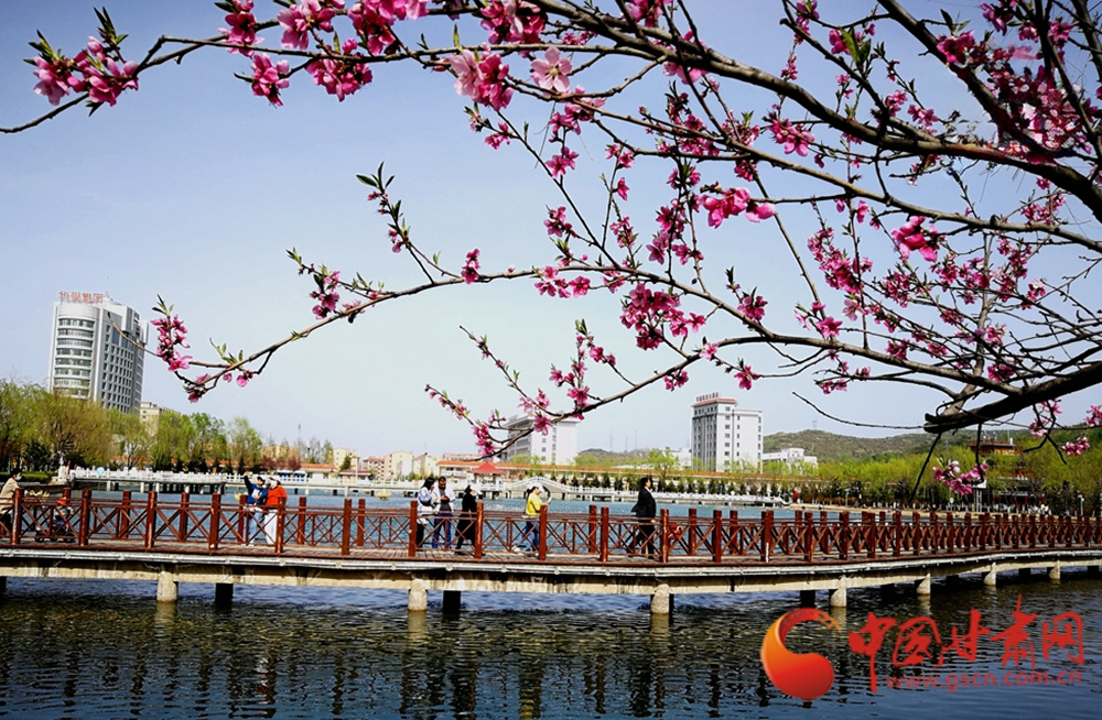 蓮湖岸畔,粉艷桃花垂枝映水,棧橋上行人悠然漫步,樓宇靜立,一派生機(jī)盎然
