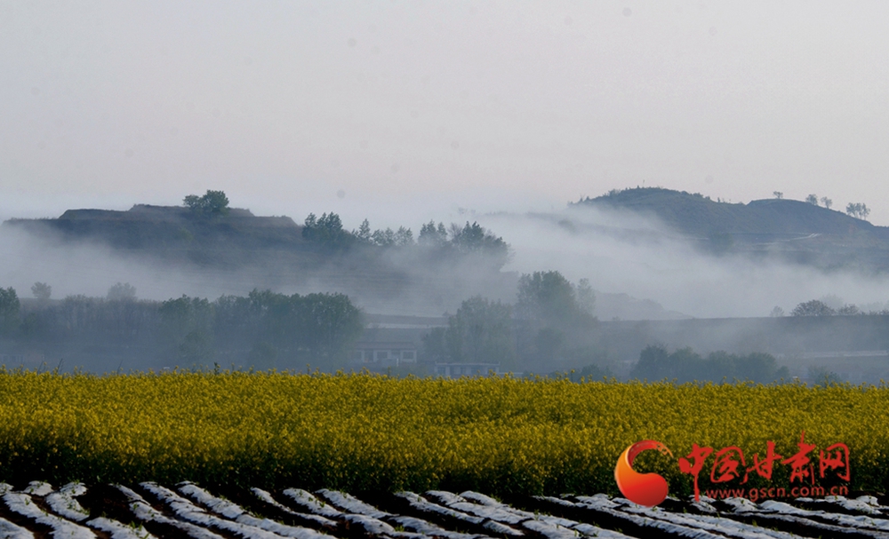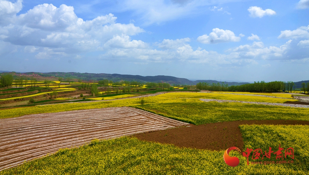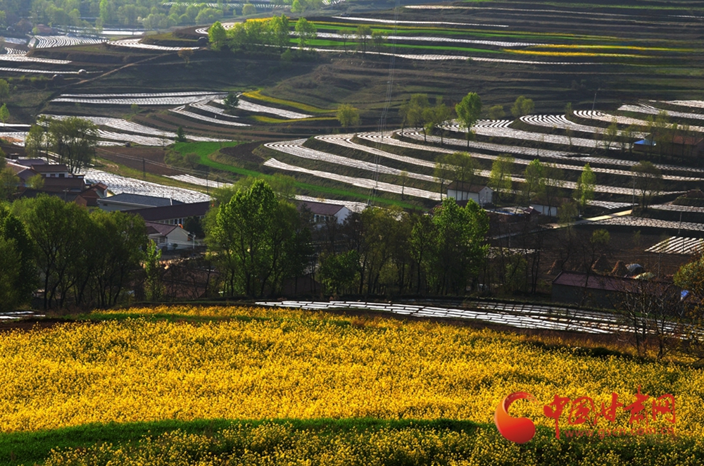 金黃的油菜花田與層層梯田相映成趣,錯(cuò)落的村落掩映在綠樹間,這是黃土坡上的春日盛景