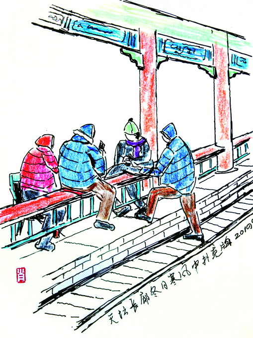 真的,如果不是畫畫,只是在那里坐著,不會有人和你搭訕。據說有人曾經創(chuàng)造了一個“城市最強悍邏輯”的理論,雖然有幾千萬人和你在同一座城市,與你發(fā)生聯(lián)系的,只有那么幾個、幾十個。遠離現(xiàn)代城市的喧囂漩渦,在古老的天壇,卻可以創(chuàng)造這樣的奇跡——讓你與更多人發(fā)生聯(lián)系。雖然是萍水相逢,但就是這些素不相識的人,最能敞開心扉,沒有負擔地說說心里話,甚至透露一下心底的秘密。如果讓我也創(chuàng)造一個城市邏輯的話,或許可以叫“城市萍水相逢邏輯”,在這個邏輯中,可以讓完全陌生變?yōu)橐老≡?,讓擦肩而過變?yōu)閮A心交談,讓潛藏心底的如水草般搖曳纏裹的秘密,變?yōu)楦〕鏊婢`放的睡蓮。天壇讓人們被瑣碎生活揉搓得皺巴巴的心,變得如花般盛放、如天空般爽朗。
