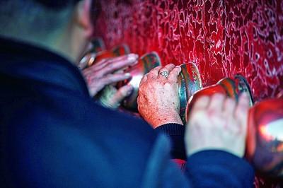 游客們撫摸著午門(mén)正門(mén)的門(mén)釘,走進(jìn)故宮參觀。