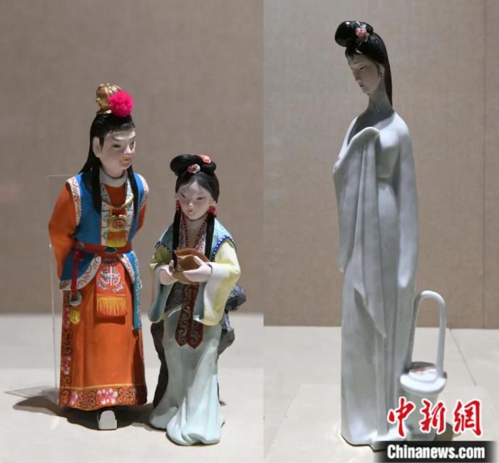 紅樓夢題材泥塑《讀西廂》和瓷塑《黛玉葬花》。中新社發(fā) 許建梅 攝