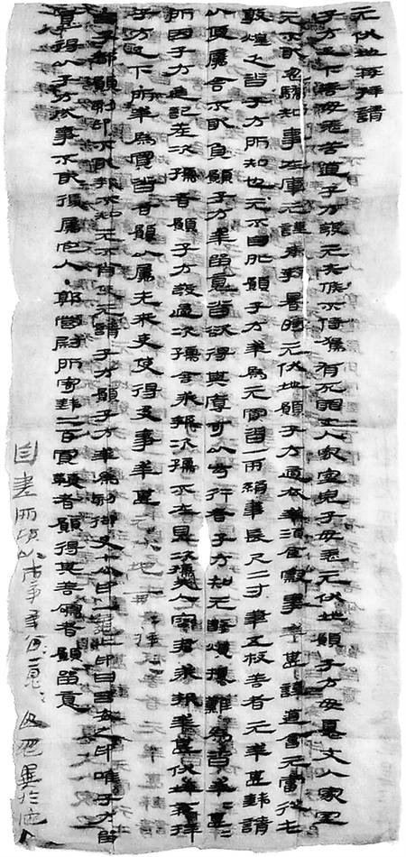 子方足下,善毋恙!苦道子方發(fā),元失候不侍駕,有死罪。丈人、家室、兒子毋恙,元伏地愿子方毋憂。丈人、家室元不敢忽驕,知事在庫,元謹奉教。暑時元伏地愿子方適衣、幸酒食、察事,幸甚!謹?shù)溃簳攺耐投鼗停?,子方所知也。元不自外,愿子方幸為元買沓一兩,絹韋,長尺二寸;筆五枚,善者,元幸甚。錢請以便屬舍,不敢負。愿子方幸留意,沓欲得其厚、可以步行者。子方知元數(shù)煩擾,難為沓。幸甚幸甚!所因子方進記差次孺者,愿子方發(fā)過次孺舍,求報。次孺不在,見次孺夫人容君求報,幸甚,伏地再拜子方足下!所幸為買沓者,愿以屬先來吏,使得及事,幸甚。元伏地再拜再拜!