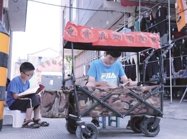 頭上戴著斗笠,臉上掛著靦腆的笑,推著裝滿課外書的迷彩小推車,趕往外婆家附近的集市擺攤。最近,14歲少年王子悅開辦“流動圖書館”的視頻感動了很多網(wǎng)友。