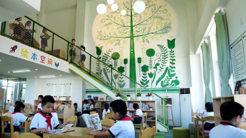 小學生在校內(nèi)繪本館自主閱讀繪本