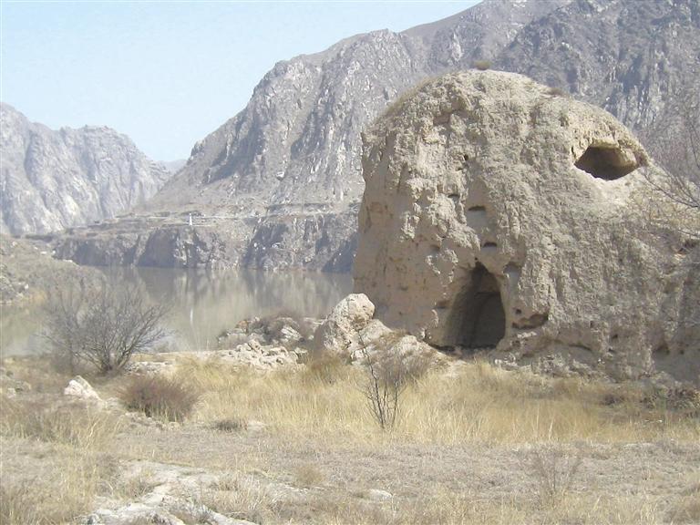 東坪向東300米,就是榆中境內(nèi)唯一遺留的一處漢長城遺址,該遺址現(xiàn)只有一處墻墩,緊鄰黃河,圍長40 余米,高約5米,無任何防護(hù)措施,墻壁上,有磚、石混雜其中,人工夯筑之痕清晰可辨。西側(cè)墻面上,還有人掏挖的小窯洞。高1.3米,深達(dá)50厘米。破壞嚴(yán)重。漢長城遺址再向東200米,東金公路向右拐入七峴溝,向來紫堡川而去,而黃河則被東面的大山阻擋,無路可去,左拐北折而流向什川。此處就是著名的黃河大“幾”字灣的第一灣。第一灣的南岸,有十來戶人家,地名叫駱圈灣。由于地處古絲綢之路,曾建有駱駝圈和小型客棧供駱駝客隊(duì)歇腳而又在黃河拐彎處而得名,后來,因諧音,叫羅泉灣。山腳下,有七八棵楊柳已吐綠。沿黃河,已無路可尋,就沿洪水沖的山溝上東山,還是無路,甚至沒有羊腸小道,巖石裸露,怪石嶙峋,坡陡難行。巖石層只有七八十米厚。此山的石頭,含有石英成分,石質(zhì)軟,無開采利用價(jià)值。再往上,就是黃土層,直到山頂。由于干旱,整個(gè)山上,無一棵樹木,甚至連灌木都沒有。耐堿耐旱的駱駝蓬只發(fā)出二厘米的枝蔓,一些蒿草和矮草,也剛發(fā)芽,還有一些匍匐在地面的無名小草,卻已開出了扁豆大小的艷麗的小花,有白色的和淡藍(lán)色的蝴蝶飛起飛落。爬到半山腰,太陽已全面照曬,山坡雖陡峭,卻無陰涼可乘。渾身發(fā)熱,不得不解開衣扣,緩慢前行。