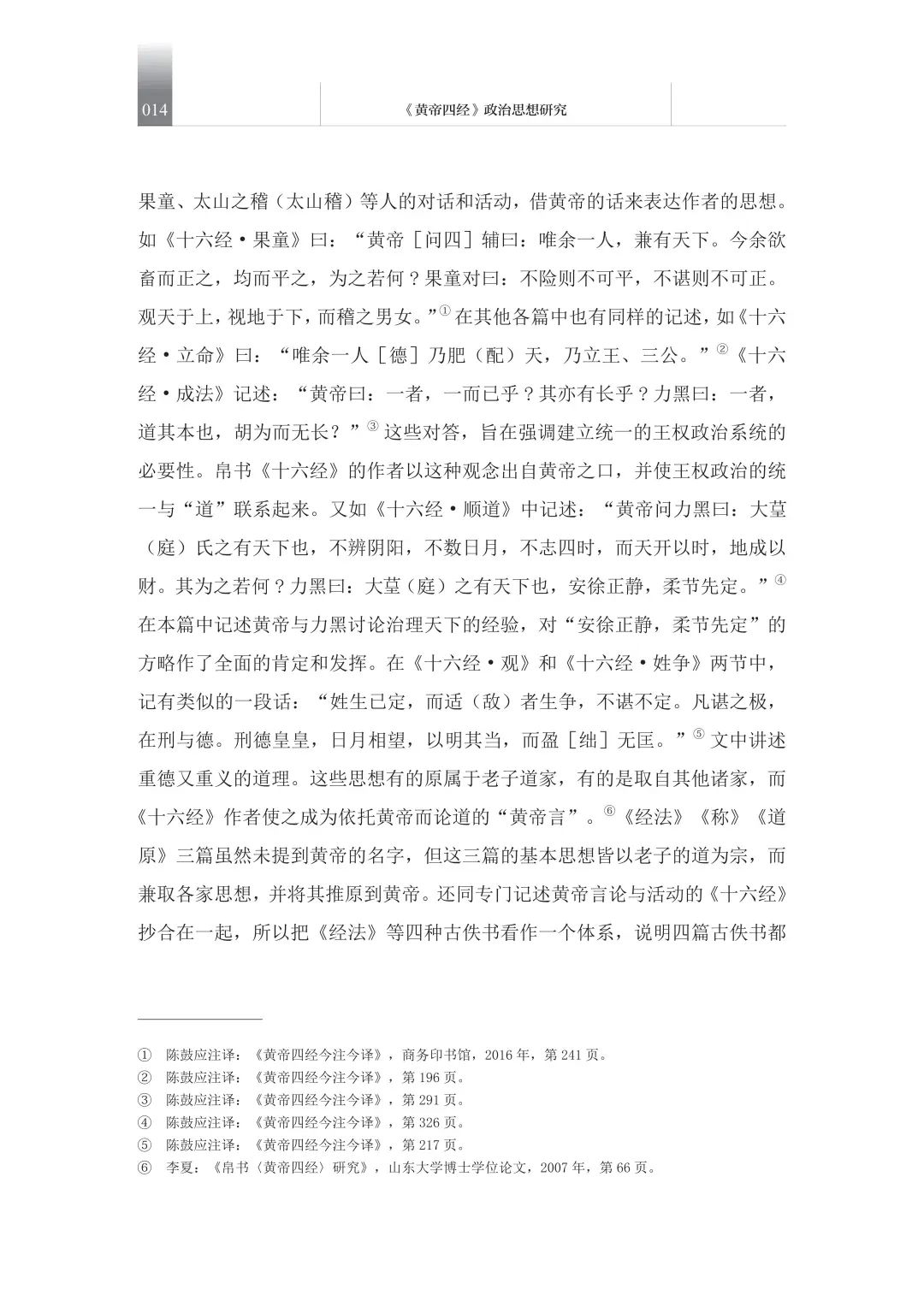 《黃帝四經(jīng)》作為東周之前各朝修身治國(guó)的指導(dǎo)性經(jīng)典,其修身治世功用迄今依然具有極高的現(xiàn)實(shí)意義和指導(dǎo)價(jià)值。本書以《黃帝四經(jīng)》為研究起點(diǎn),重點(diǎn)探索黃老政治思想中的重要概念,并試圖從核心詞匯“道”“德”概念的演變及其相互作用來(lái)探究黃老學(xué)說(shuō)的起源發(fā)展的學(xué)術(shù)邏輯,尤其從“德”含義的拓展與遷移去分析黃老哲學(xué)政治德性的建立,隨之引出黃老政治思想中的重要概念“道法”“刑名”“刑德”“因循”等,并希望由此描摹出黃老政治思想的特性。