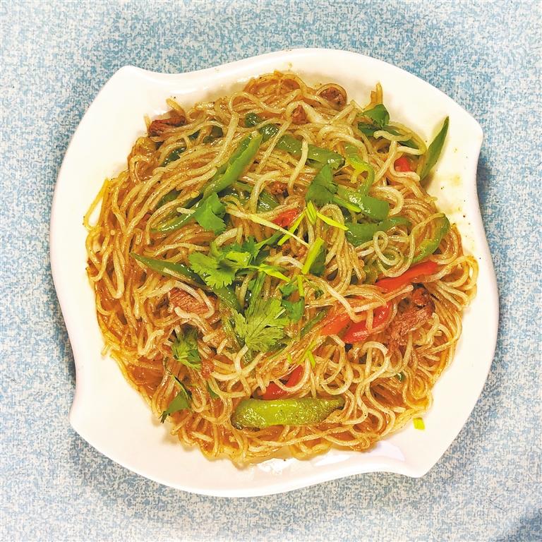 肉末粉條,是一道葷素搭配,鮮香爽口的家常菜。這道菜所用的水粉是由紅薯、馬鈴薯、大豆等原料加工制成的粉條。水粉是臨夏的特產(chǎn),它色白,條細(xì),養(yǎng)分多,適于熬菜,烹炒和涼拌菜用,口感爽滑有韌性,頗受食客喜愛。