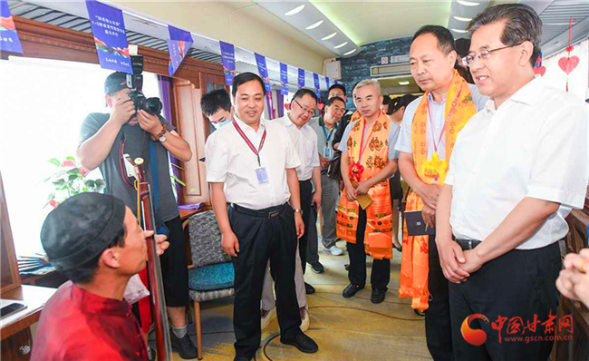 專列到達(dá)西安南站后,陜西省文旅廳及文旅相關(guān)部門對(duì)“環(huán)西部火車游”專列的到來(lái)表示熱烈的歡迎,陜西省文旅廳負(fù)責(zé)人在甘肅省委宣傳部副部長(zhǎng)、省文旅廳黨組書(shū)記、廳長(zhǎng)陳衛(wèi)中和武威市文體廣電和旅游局負(fù)責(zé)人的陪同下參觀了“環(huán)西部火車游”武威館,并欣賞了國(guó)家級(jí)非遺項(xiàng)目“涼州賢孝”表演。