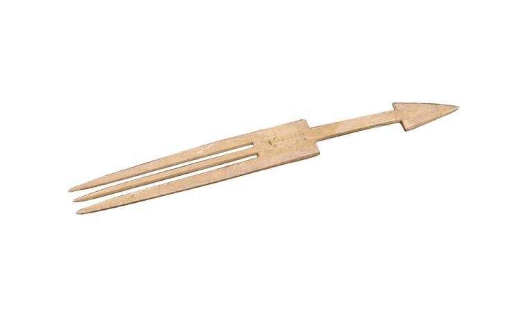 再看一柄骨叉,這柄骨叉同樣是齊家文化時(shí)期的產(chǎn)物,距今有4000年之久了,若不是文物標(biāo)明年代,真不敢相信它是數(shù)千年前的先民所制。這柄骨叉長15.8厘米、寬1.8厘米、厚0.2厘米,叉部呈長方形,尖端為三齒,細(xì)長方形柄,柄端呈三角形。去掉柄端的三角造型,這柄骨叉與現(xiàn)在餐桌上的叉子有什么分別呢?最難得的是,這柄骨叉制作得如此規(guī)整,打磨得這般光滑,想想看,它可是新石器時(shí)代先民的手工活,制作竟如此精美,真令人嘆服!