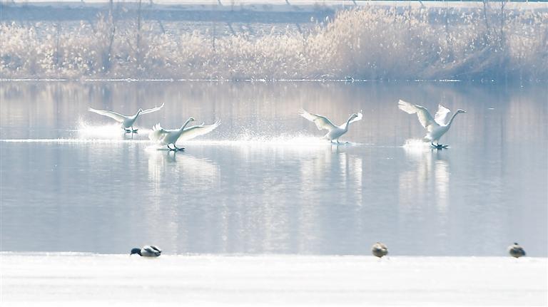 近日,永靖縣鹽鍋峽鎮(zhèn)境內(nèi)的黃河八盤峽水庫成為天鵝等候鳥越冬的樂園,它們在此棲息、覓食,成為冬日黃河里的一道靚麗風景。 本報記者 史有東 攝