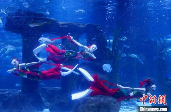 身著綠衣紅褲的飛天舞蹈服、腳穿雙蹼,在5米多深的人造海水中與海洋精靈共舞,在蘭州極地海洋世界,三位“美人魚(yú)”表演“海底飛天”,吸引眾多游客觀看。