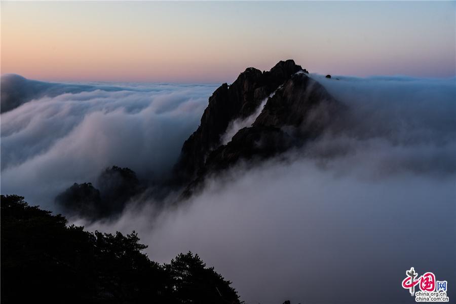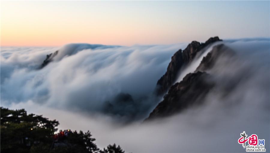 凌晨,當(dāng)云海隨著氣流漫過天都峰與蓮花峰時(shí)瘋狂的傾瀉而下,浩浩蕩蕩直奔東方注入大海,成就浩瀚的海洋。