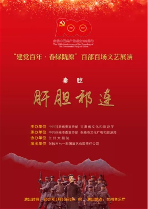 中國甘肅網(wǎng)5月28日訊(本網(wǎng)記者 宋芳科)5月30日晚,剛剛斬獲第六屆甘肅戲劇紅梅獎大賽“紅梅劇目獎”第一名的好成績的秦腔戲《肝膽祁連》,將在蘭州音樂廳精彩上演?!陡文懫钸B》以真實的歷史故事改編,講述了民主人士高金城營救紅西路軍戰(zhàn)士的感人故事。屆時,中國甘肅網(wǎng)將現(xiàn)場直播,歡迎廣大網(wǎng)友點擊進入直播間,重溫一段波瀾壯闊而又感人至深的歷史,一起向祁連英魂高金城致敬。