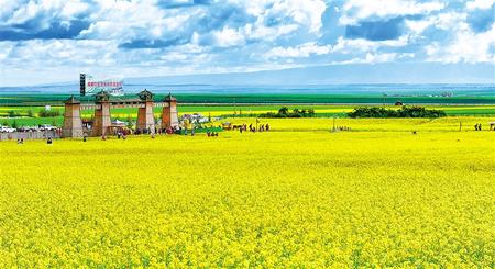 沿著國道227行走,放眼望去,遠(yuǎn)處祁連山脈高峰聳立,近處起伏的山丘高低錯落,山間綠草如茵,色彩斑斕的野花星星點點播撒在綠草之中。山坡上點綴的牛羊安靜地吃草,呈現(xiàn)出一派安靜祥和的田野風(fēng)光。最耀眼的當(dāng)屬這里的油菜花,處處可見金黃一片,成為七月河西走廊一道亮麗的風(fēng)景。