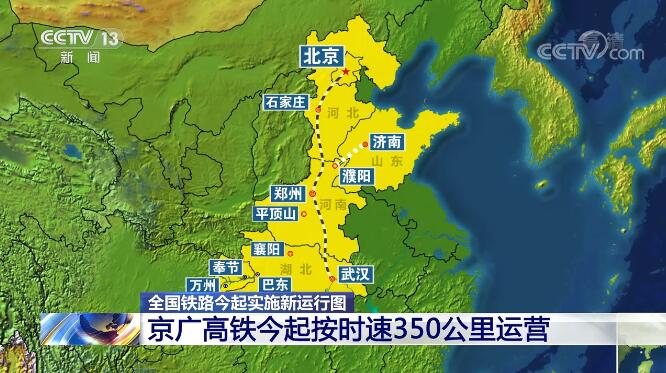 京廣高鐵從北京至武漢這一段,今天起按時(shí)速350公里運(yùn)營,新型復(fù)興號智能動(dòng)車組列車上線。從北京到武漢,旅行時(shí)間縮短到4小時(shí)以內(nèi)。