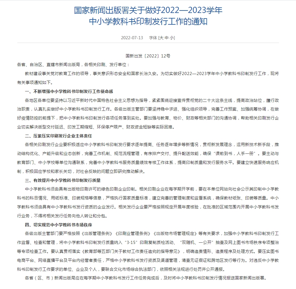 13日,國(guó)家新聞出版署網(wǎng)站發(fā)布《國(guó)家新聞出版署關(guān)于做好2022—2023學(xué)年中小學(xué)教科書印制發(fā)行工作的通知》(以下簡(jiǎn)稱《通知》)。其中強(qiáng)調(diào),各相關(guān)印刷發(fā)行企業(yè)要積極適應(yīng)中小學(xué)教科書印制發(fā)行要求逐年提高、任務(wù)逐年增多等新情況?!锻ㄖ返淖詈蟊硎荆袑?shí)規(guī)范中小學(xué)教科書市場(chǎng)秩序。
