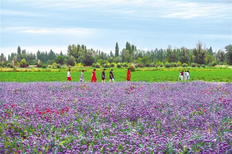 8月7日,游人在敦煌月牙泉鎮(zhèn)百畝花田游覽。 新甘肅·甘肅日報通訊員 王斌銀