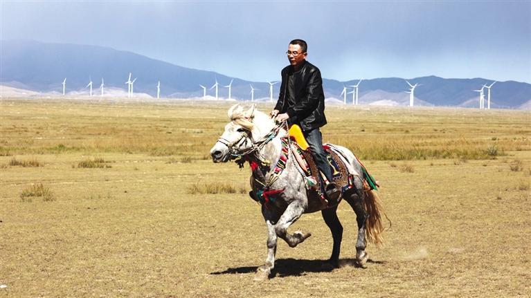 驅(qū)車(chē)向草原腹地進(jìn)發(fā),遠(yuǎn)遠(yuǎn)就能看見(jiàn)有人在馴馬。馴馬者房利軍和他的坐騎“尕青”仿佛“人馬合一”,同呼吸、共步調(diào),一遍遍練習(xí),像走,更像飛。這便是傳說(shuō)中的走馬文化,和跑馬的加速度不同,走馬不管是走還是跑,都是快步勻速,短途速度快,長(zhǎng)途耐力強(qiáng),騎乘平穩(wěn),姿態(tài)優(yōu)美,觀賞性強(qiáng)。在牧區(qū),走馬實(shí)用性強(qiáng),深受當(dāng)?shù)厝藲g迎。曾有專(zhuān)家稱(chēng),“馬踏飛燕”的“馬”即為走馬。每天,和武威天祝一山之隔的這片草原,都與房利軍有關(guān),在這里,他專(zhuān)心馴馬,而他的500只羊則在一旁撒歡。尤其從高空俯瞰,草原牧羊的畫(huà)面甚是壯觀??赐犟Z馬,房利軍騎馬帶路,采訪(fǎng)車(chē)沿著馬道回到了“家”。