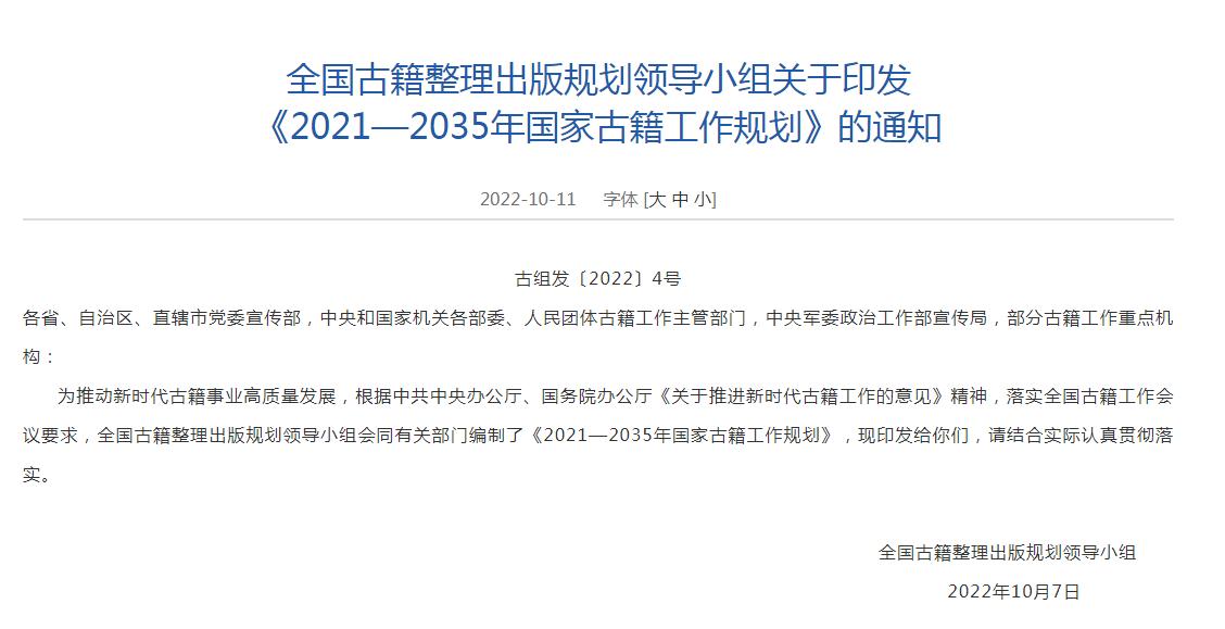 12日,據(jù)國(guó)家新聞出版署網(wǎng)站消息,全國(guó)古籍整理出版規(guī)劃領(lǐng)導(dǎo)小組會(huì)同有關(guān)部門編制了《2021—2035年國(guó)家古籍工作規(guī)劃》,其中提到,至2035年,古籍工作體制機(jī)制更加完善,以重大工程為引領(lǐng),加強(qiáng)古籍工作全局性謀劃,重點(diǎn)實(shí)施 《永樂大典》、敦煌文獻(xiàn)系統(tǒng)性保護(hù)整理出版工程等。