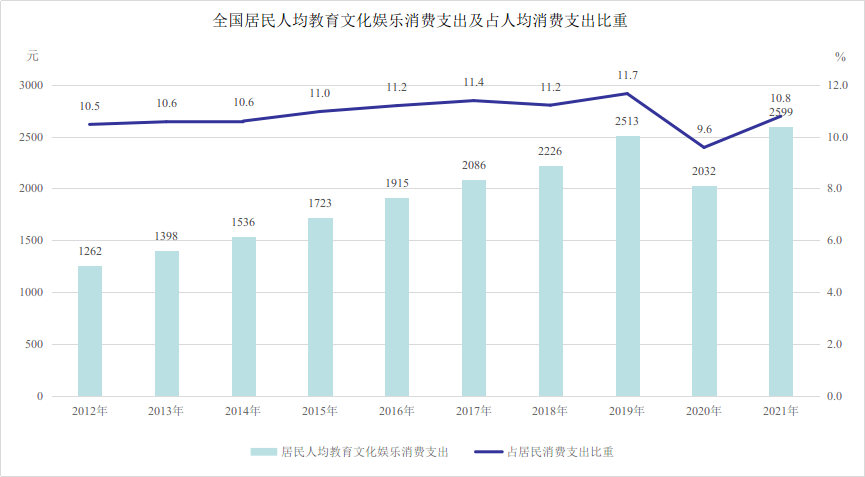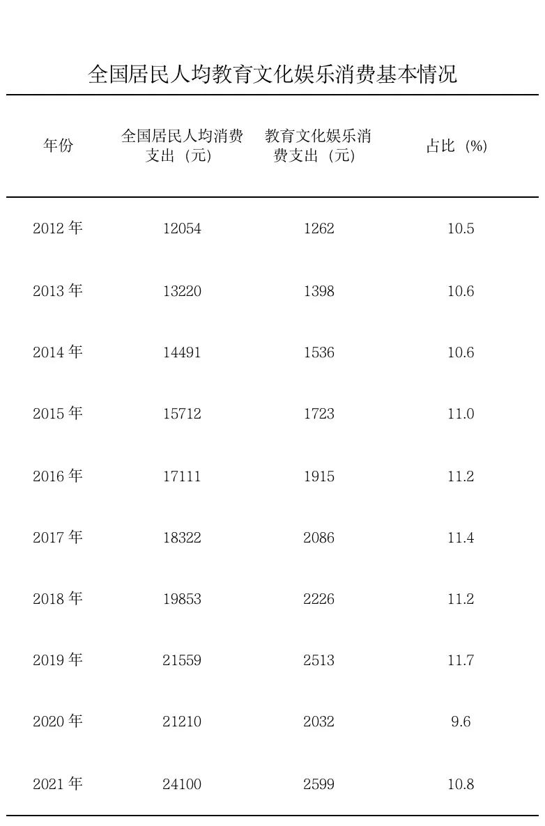 記者從文化和旅游部獲悉,十年來,文化產(chǎn)品和服務(wù)供給不斷豐富,促進文化和旅游消費取得顯著成效。2021年,全國居民人均教育文化娛樂支出2599元,較2012年增長105.9%。